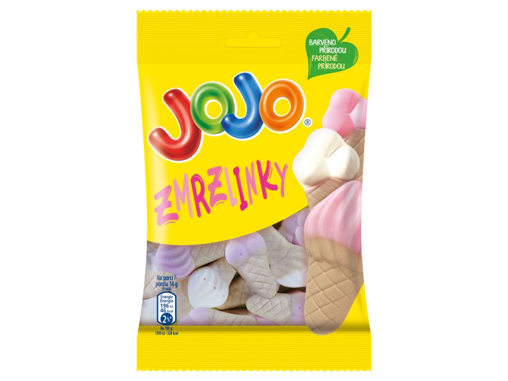 JOJO zmrzlinky - SLOŽENÍ: Cukr, glukózový sirup, pitná voda, želatina, kyselina (kyselina citronová), aromata (oplatka, zmrzlina, jahoda), jedlá sůl, palmový olej 0,1 %**, lešticí látka (karnaubský vosk), karamelový sirup (cukr, voda), koncentrát šťávy z černé mrkve** Palmový olej je použit z certifikovaných zdrojů. VÝŽIVOVÉ ÚDAJE/JEDNOTKA: Výživové hodnoty na 100g:Energetická hodnota / Energia 1359,0 kJ / 328,0 kcal Tuky <0,5 g - z toho nasycené / nasýtené mastné kyseliny 0,2 g Sacharidy 76,0 g - z toho cukry 66,0 g Vláknina <0,5 g Bílkoviny / Bielkoviny 5,5 g Sůl / Soľ 0,03 gBalení obsahuje 5 porcí. Porce by měla být upravena pro děti různých věkových kategorií. VÝŽIVOVÉ ÚDAJE/PORCE: Výživové hodnoty na porci (14,0 g - 4 želé):Energetická hodnota / Energia 196,0 kJ / 46,0 kcal Tuky <0,5 g - z toho nasycené / nasýtené mastné kyseliny <0,1 g Sacharidy 11,0 g - z toho cukry 9,2 g Vláknina <0,5 g Bílkoviny / Bielkoviny 0,8 g Sůl / Soľ <0,01 g. PŮVOD Česká republika. VÝROBCE: Nestlé Česko s.r.o.Mezi Vodami 2035/31143 20 Praha 4.