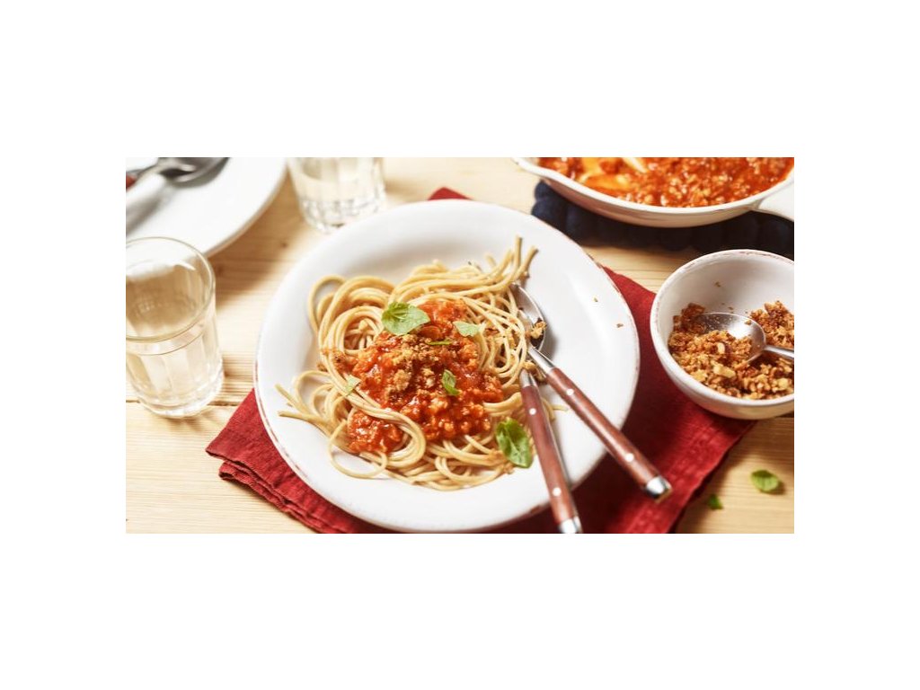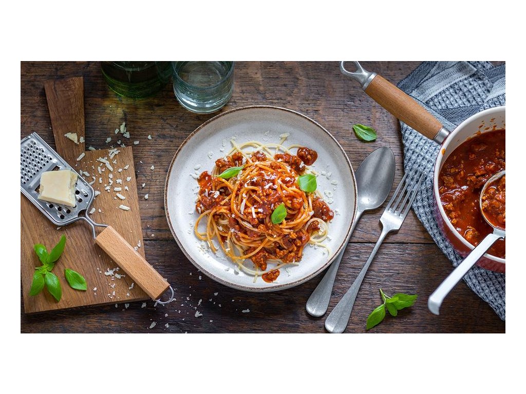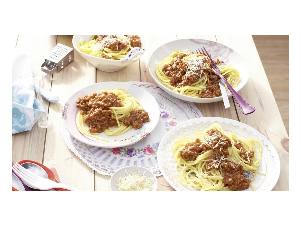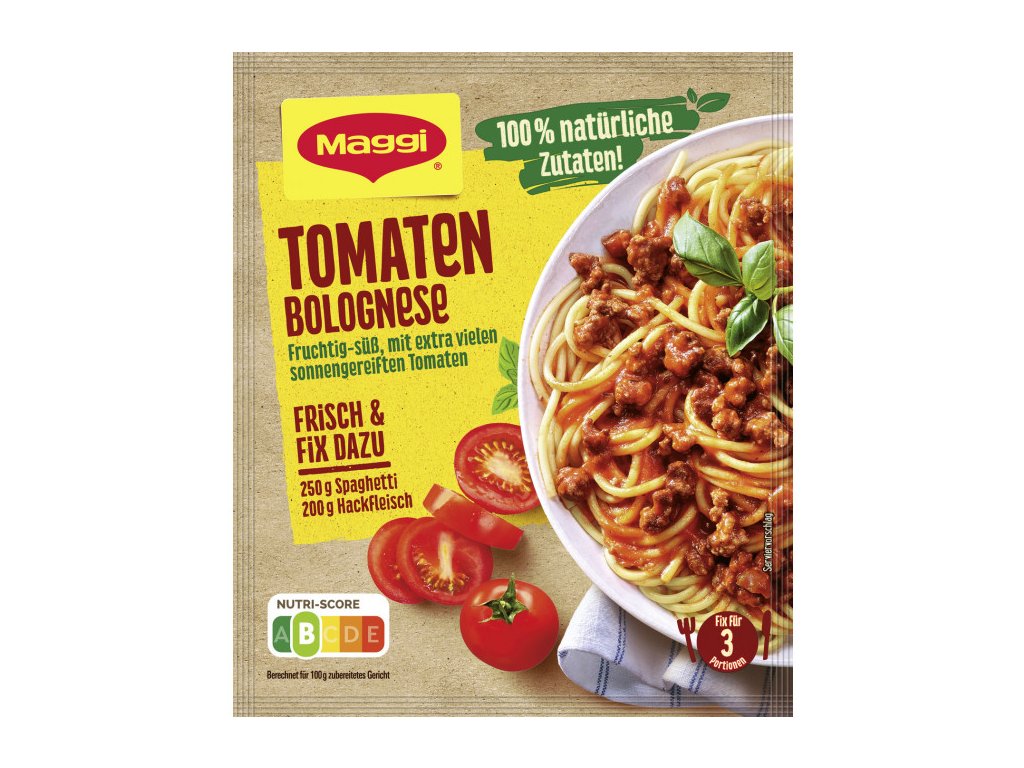 Návod: Uvařte 250g špaget a osmažte 200g hovězího mletého masa. Obsah sáčku smíchejte s 300ml vody a vařte 5 minut za občasného míchání. Do omáčky zamíchejte osmažené maso, a podávejte se špagetami.