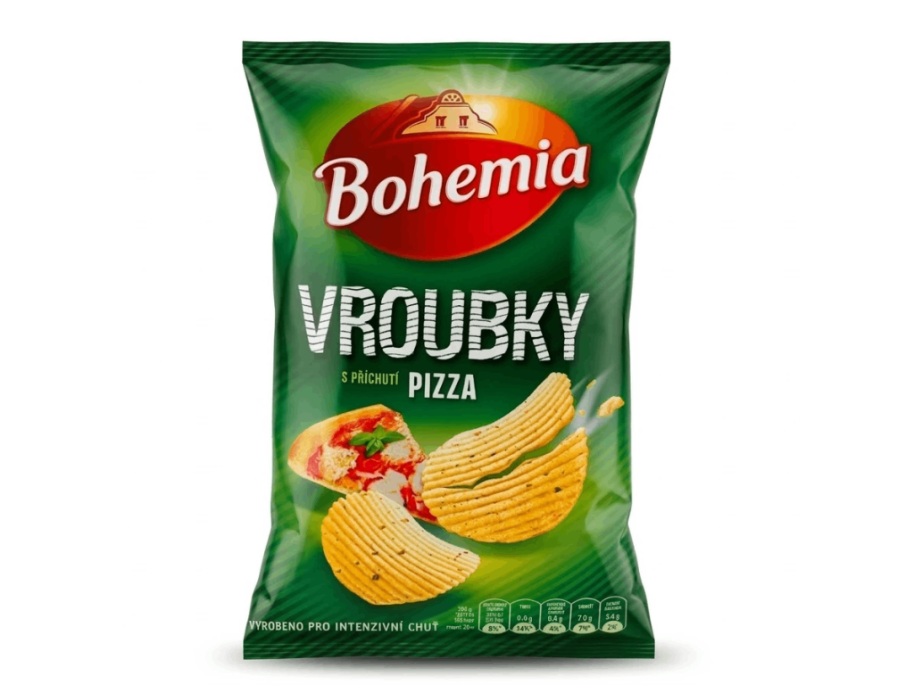 Bohemia Vroubky Pizza jsou stvořeny pro ty, kteří milují výraznou chuť a pořádné křupnutí. Tajemství jejich úspěchu tkví ve spojení kvalitních českých brambor, slunečnicového oleje a unikátního vroubkování, které na povrchu udrží maximum pizza koření. V každém chipsy ucítíte tóny zralých rajčat, cibule, česneku a typických bylinek, jako je bazalka a oregano.