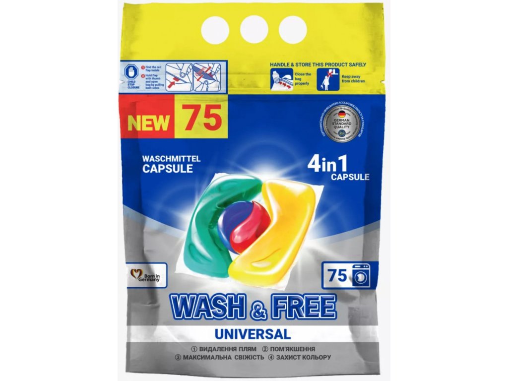 Wash & Free Universal 4in1 gelové kapsle na praní jsou ideálním řešením pro každodenní péči o prádlo. Díky čtyřnásobné síle přináší vynikající výsledky: efektivně odstraňují skvrny, zanechávají prádlo dlouhodobě svěží, chrání textilní vlákna a zároveň pečují o kvalitu a měkkost materiálu. Gelové kapsle jsou jednoduché na použití – každá kapsle obsahuje přesně odměřenou dávku pracího gelu, která se zcela rozpustí i při nízkých teplotách. Jejich univerzální složení je vhodné pro všechny druhy prádla, takže můžete s jedním produktem prát barevné i bílé oděvy. Vyzkoušejte Wash & Free Universal 4in1 a užijte si čistotu bez kompromisů!