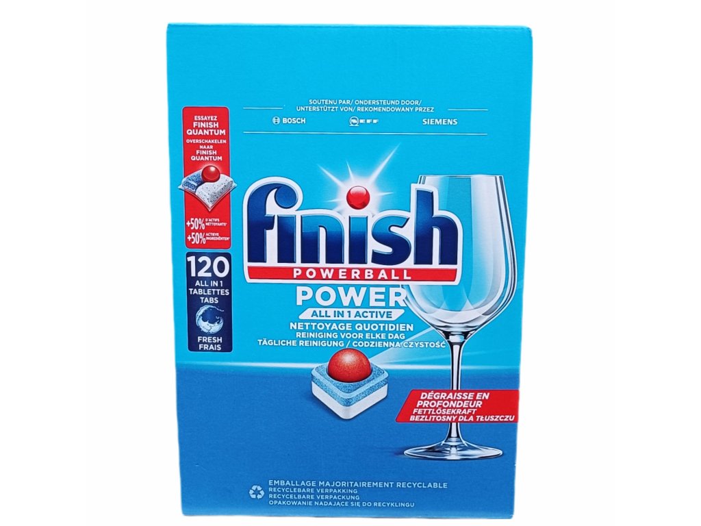 Spolehněte se na sílu značky Finish, doporučované předními výrobci myček, a dosáhněte skvělých výsledků mytí bez námahy. Tablety Finish Powerball All in 1 Active jsou navrženy pro každodenní použití a bojují i s náročnými nečistotami, které na nádobí zanecháte. Jejich multifunkční složení se postará nejen o nádobí, ale i o vaši myčku.