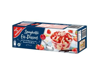 Vychutnejte si klasický zmrzlinový dezert v originálním balení! Špagetová zmrzlina Gut & Günstig kombinuje lahodnou bourbonskou vanilkovou zmrzlinu s ovocnou jahodovou omáčkou a hoblinkami bílé čokolády. Chytré balení se dá snadno proměnit ve stylový pohár. Balení obsahuje 3 samostatné porce.